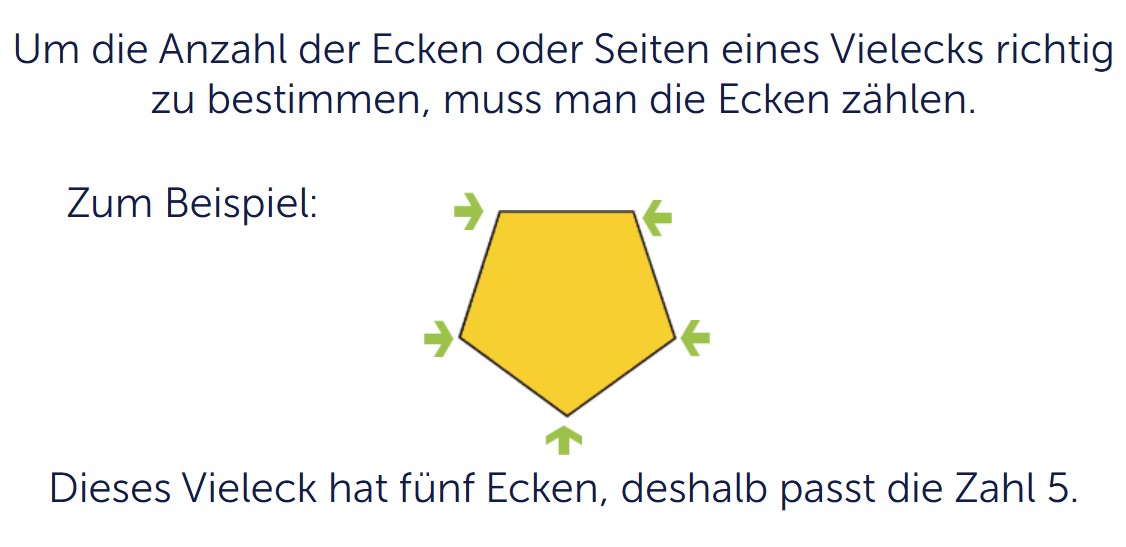 Vielecke sind geschlossene Figuren mit geraden Seiten. Jede Seite verbindet sich mit der nächsten an einer Ecke. Bei einem Vieleck ist die Anzahl der Seiten immer genauso groß wie die Anzahl der Ecken. Darum hilft dir ein einfacher Trick: Wenn du unsicher bist, zähle die Ecken. So findest du schnell die richtige Zahl. In der Lösung wird das an einem Fünfeck gezeigt: Es hat fünf Ecken, also passt auch die Zahl 5.