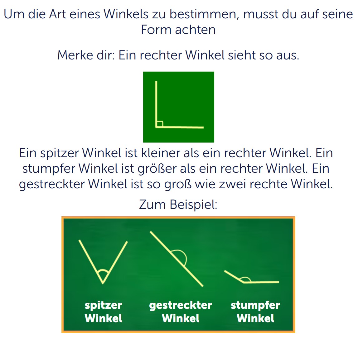 Zur Orientierung kannst du dir merken: Ein rechter Winkel hat . Ein gestreckter Winkel hat . In dieser Aufgabe musst du aber nicht rechnen. Du erkennst die Winkel vor allem an ihrem Aussehen. Das ist besonders gut für den Einstieg, weil du ein Gefühl für geometrische Formen entwickelst.