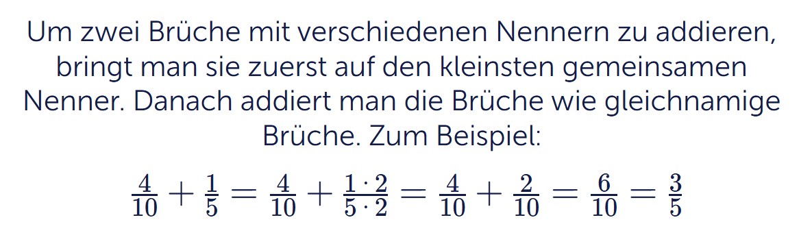 Auf dieser Übungsseite lernst du, wie du Brüche mit verschiedenen Nennern addierst. Im Beispiel siehst du die Aufgabe . Damit du addieren kannst, müssen beide Brüche zuerst den gleichen Nenner haben. Darum wird zu erweitert. Danach ist das Rechnen viel leichter: .