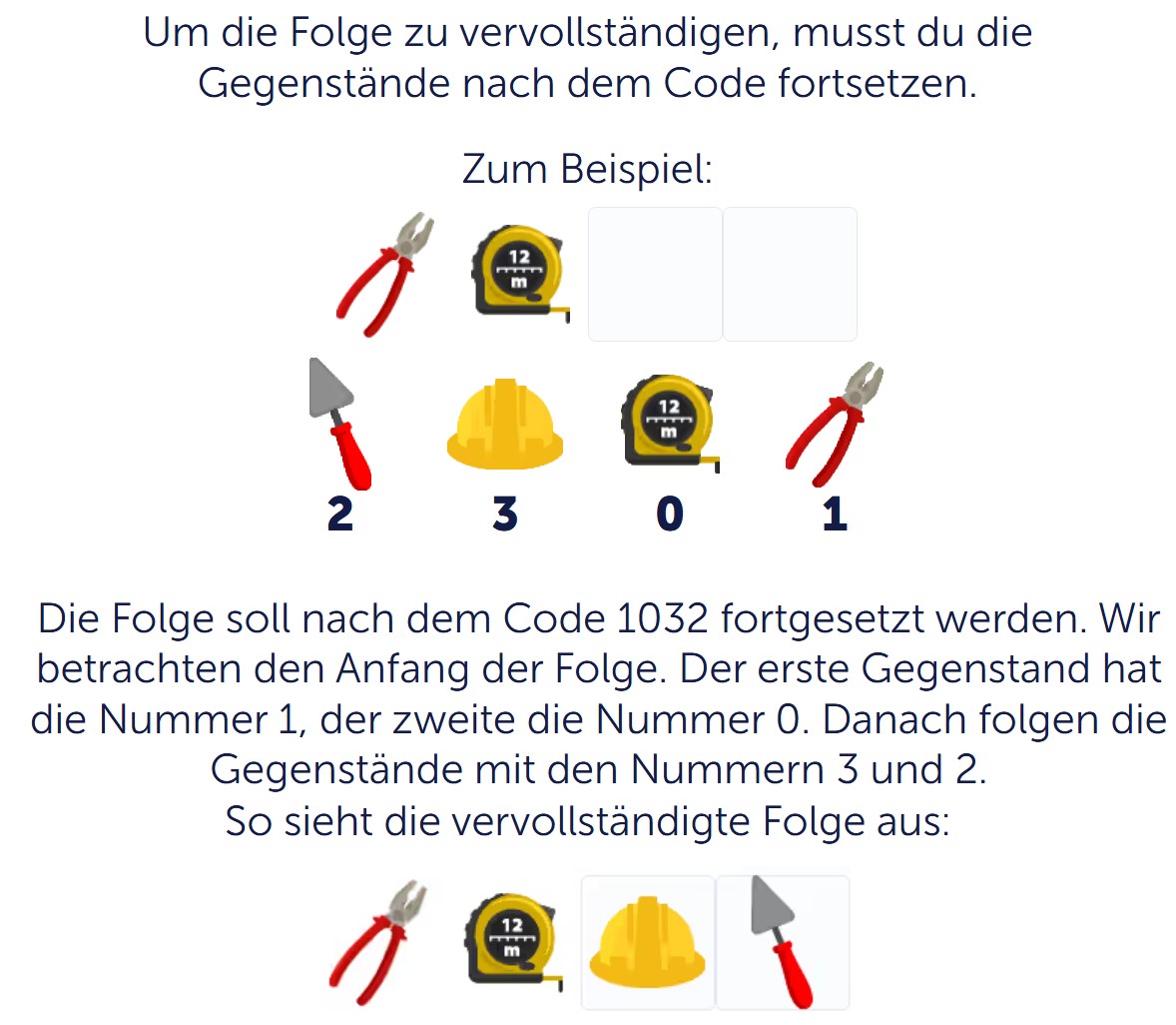 Auf dem Bildschirm sieht das Kind den Anfang einer solchen Folge, in der die ersten Gegenstände bereits vorgegeben sind. In der Aufgabenstellung darüber wird der Code angegeben, also die Zahlenfolge. Das Schulkind analysiert diesen Code, betrachtet den Beginn der Folge und geht anschließend zum Entschlüsseln der Gegenstände über.
