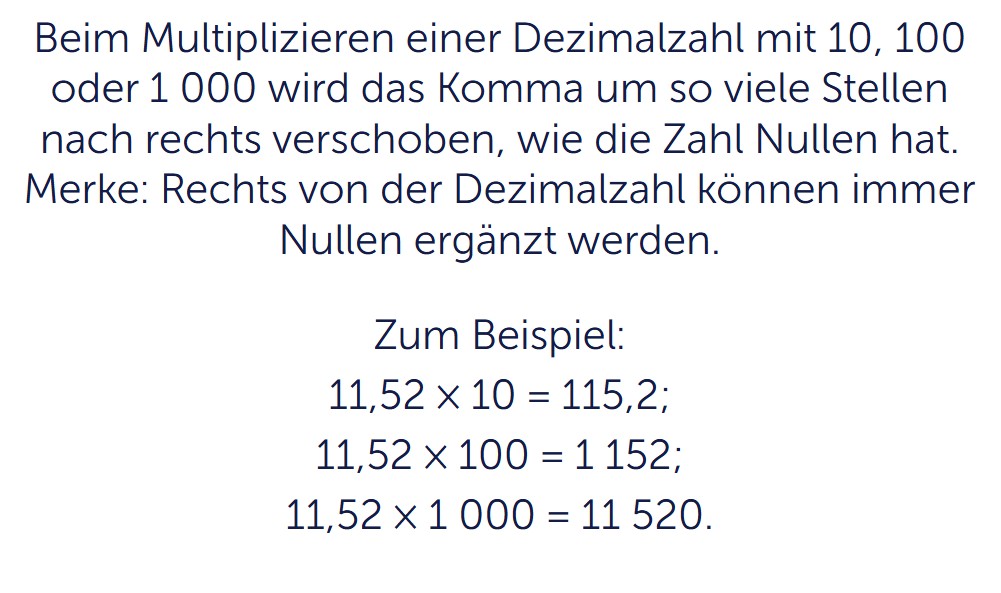 Muster in der Anzahl der Nullen im Produkt erklären, wenn eine Zahl mit einer Zehnerpotenz multipliziert wird. Ebenso Muster in der Verschiebung des Dezimalkommas beschreiben, wenn eine Dezimalzahl mit einer Zehnerpotenz multipliziert oder durch eine Zehnerpotenz dividiert wird.