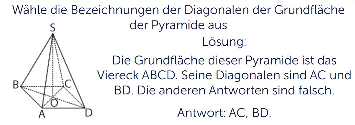 Bei einem Quader ist das besonders gut zu erkennen. Zur Grundfläche gehören die Seitenflächen, die direkt an ihr entlanglaufen. Diese Seitenflächen stehen senkrecht auf der Grundfläche. In der Aufgabe helfen dir die Namen der Flächen. Eine Fläche wird immer durch ihre Eckpunkte benannt. Du musst also genau schauen, welche Punkte zusammen eine Seitenfläche des Quaders bilden.