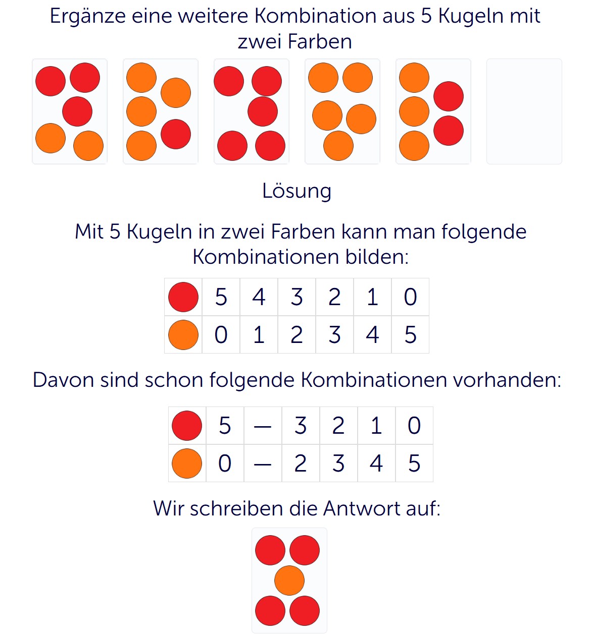 Dabei steht für die Anzahl der Kugeln in der ersten Farbe und für die Anzahl der Kugeln in der zweiten Farbe. Mögliche Verteilungen sind zum Beispiel 5 und 0, 4 und 1, 3 und 2, 2 und 3, 1 und 4 oder 0 und 5. Wenn einige davon schon zu sehen sind, kannst du herausfinden, welche Kombination noch fehlt.