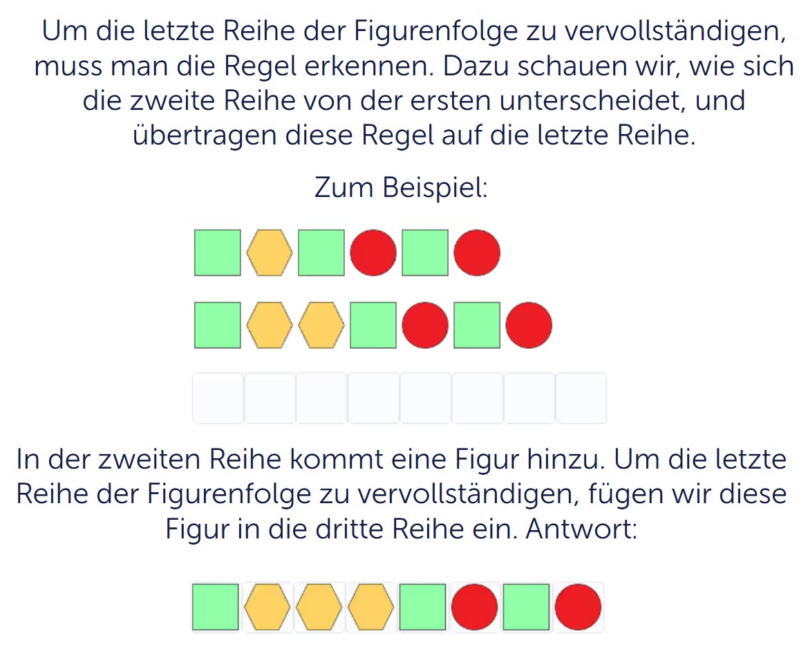 Besonders wichtig ist hier der Vergleich der oberen Reihen. Frage dich: Was ist gleich geblieben? Was ist neu dazugekommen? Wenn du die Veränderung entdeckst, kannst du dieselbe Regel auf die letzte Reihe übertragen. Genau darum geht es bei solchen Aufgaben: Muster erkennen, Unterschiede finden und die passende Fortsetzung bilden.