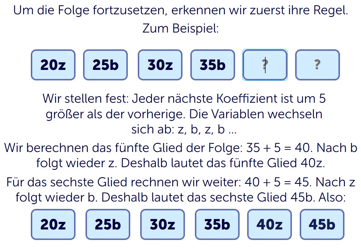 Die Regel kannst du dir so merken: Zahlenschritt plus Buchstabenmuster. Für die Zahlen gilt zum Beispiel . Nach dem Buchstaben b folgt wieder z. Deshalb ist das fünfte Glied 40z. Danach rechnest du weiter: . Nach z kommt b. Darum lautet das sechste Glied 45b.