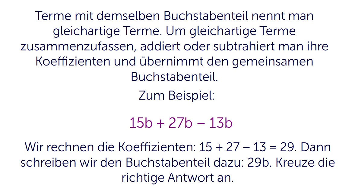 In dieser Übung lernst du, wie du gleichartige Terme zusammenfassen kannst. Das ist ein wichtiger Schritt in Mathematik der 5. Klasse. Du siehst einen Term mit demselben Buchstaben und sollst das passende Ergebnis finden. So übst du, Rechenterme mit Variablen sicher und Schritt für Schritt zu vereinfachen.