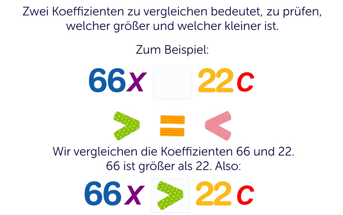 In dieser Übung lernst du, Koeffizienten in algebraischen Ausdrücken zu vergleichen. Das klingt zuerst vielleicht schwierig, ist aber gut machbar. Du schaust dabei auf die Zahl vor dem Buchstaben. Diese Zahl heißt Koeffizient. Im Beispiel siehst du die Ausdrücke und . Verglichen werden hier die Koeffizienten 66 und 22.