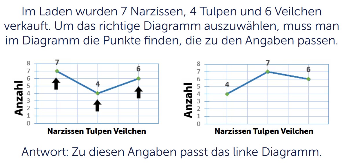 Du schaust dir dazu die Kategorien auf der waagerechten Achse an, also zum Beispiel Narzissen, Tulpen und Veilchen. Dann prüfst du auf der senkrechten Achse die Anzahl. Zu jeder Blumensorte gehört ein Wert. In einem passenden Diagramm stimmen alle drei Angaben genau mit dem Aufgabentext überein. Wenn im Text 4 Narzissen, 7 Tulpen und 6 Veilchen stehen, dann muss das Diagramm genau diese Werte zeigen.