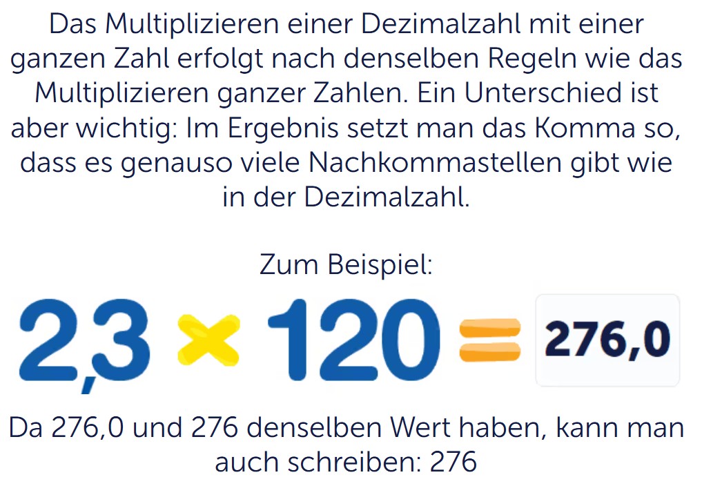 Ein Beispiel aus der Übung ist . Du kannst dir dazu merken: . Dann rechnest du erst und teilst anschließend durch 10. So erhältst du . Daran siehst du: Das Ergebnis kann trotz Dezimalzahl eine ganze Zahl sein.
