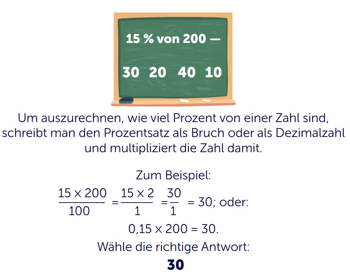 Die richtige Lösung ist also 30. In der Aufgabe wählst du diese Zahl aus den Antwortmöglichkeiten aus. So übst du, Prozentangaben sicher zu erkennen und schnell zu berechnen.