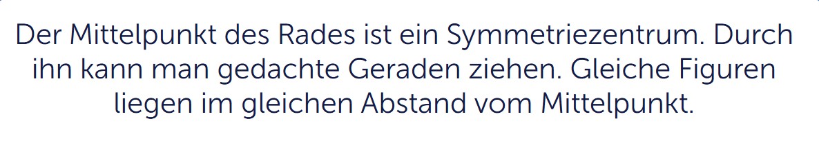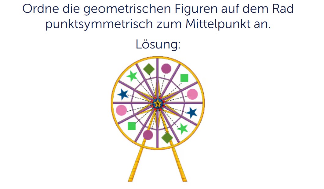 Wenn das Kind dies in allen Teilen des Gesamtbildes richtig macht, entsteht eine Symmetrie, und danach gelangt es zum nächsten Abschnitt der Aufgabe. Der Unterschied zur Achsensymmetrie besteht darin, dass die Elemente hier in größerer Zahl spiegelbildlich zueinander angeordnet werden und stärker unabhängig von den anderen Teilen des Arbeitsbereichs sind. Während man bei der Achsensymmetrie ein Objekt entlang der Achse gedanklich in zwei Hälften falten kann, ist das hier nicht möglich. Stattdessen muss jedes Figurenpaar einzeln betrachtet werden – und zwar nur aus der Sicht seiner Beziehung zum Mittelpunkt.