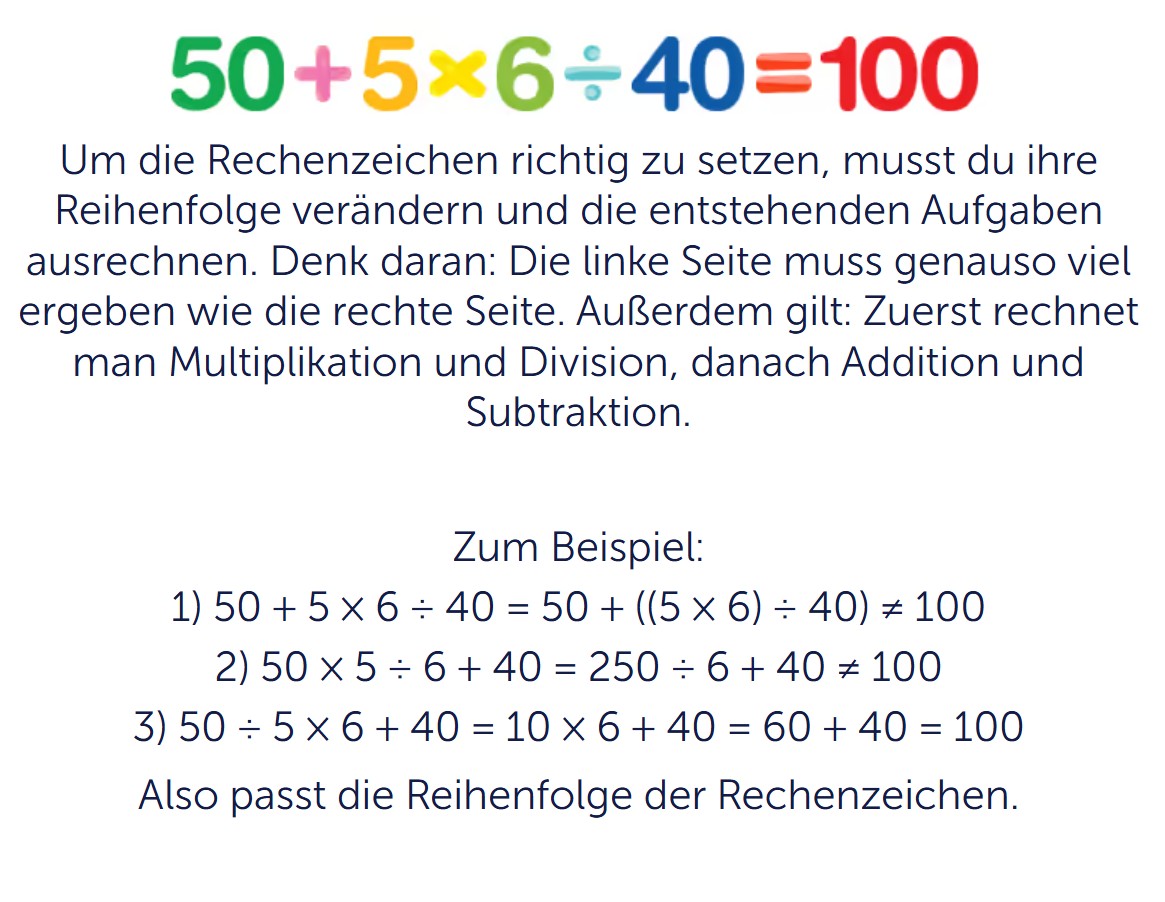 Für Eltern und Lehrkräfte ist die Aufgabe gut geeignet, um Regeln zur Reihenfolge der Rechenschritte anschaulich zu festigen. Kinder sehen direkt, dass ein Ergebnis nur dann stimmen kann, wenn die Rechenzeichen und Schritte sinnvoll beachtet werden. Das hilft beim Übergang vom einfachen Kopfrechnen zu komplexeren Termen.