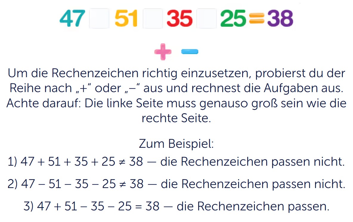 Du darfst in die Kästchen nur Plus oder Minus einsetzen. Eine mögliche Denkweise ist: Was passiert, wenn du zuerst addierst? Was passiert, wenn du später wieder etwas abziehst? So näherst du dich der richtigen Lösung. Diese Art von Aufgabe hilft dir, nicht nur zu rechnen, sondern auch geschickt zu überlegen.