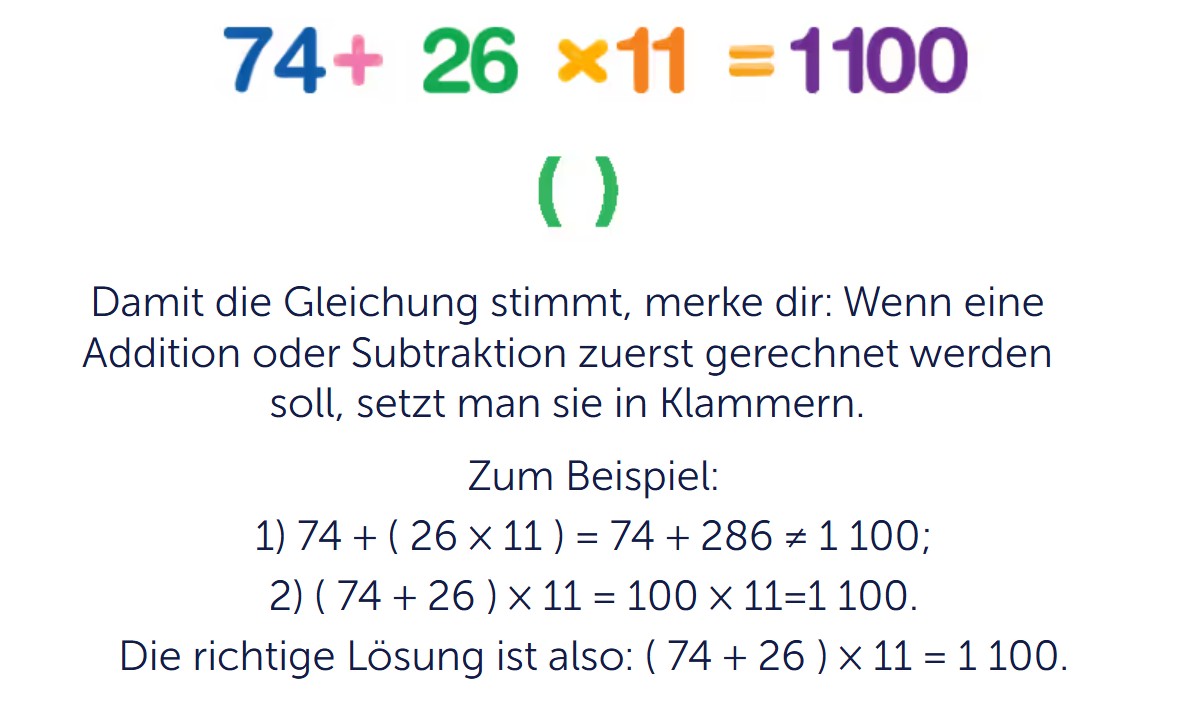 Auf der Seite siehst du eine Aufgabe wie zum Beispiel . Ohne Klammern würde man zuerst die Multiplikation rechnen. Dann passt das Ergebnis hier aber nicht. Deshalb musst du überlegen, an welche Stelle die Klammern gesetzt werden sollen. So trainierst du genaues Hinschauen und sicheres Rechnen.