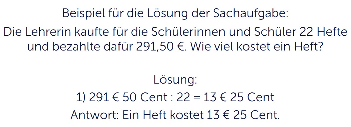Das Ergebnis bedeutet: Ein Heft kostet 13,25 €, also 13 € 25 Cent. So übst du nicht nur das Dividieren, sondern auch den sicheren Umgang mit Geldbeträgen. Du erkennst, was in einer Sachaufgabe gegeben ist, was gesucht wird und wie du Schritt für Schritt zur Lösung kommst.