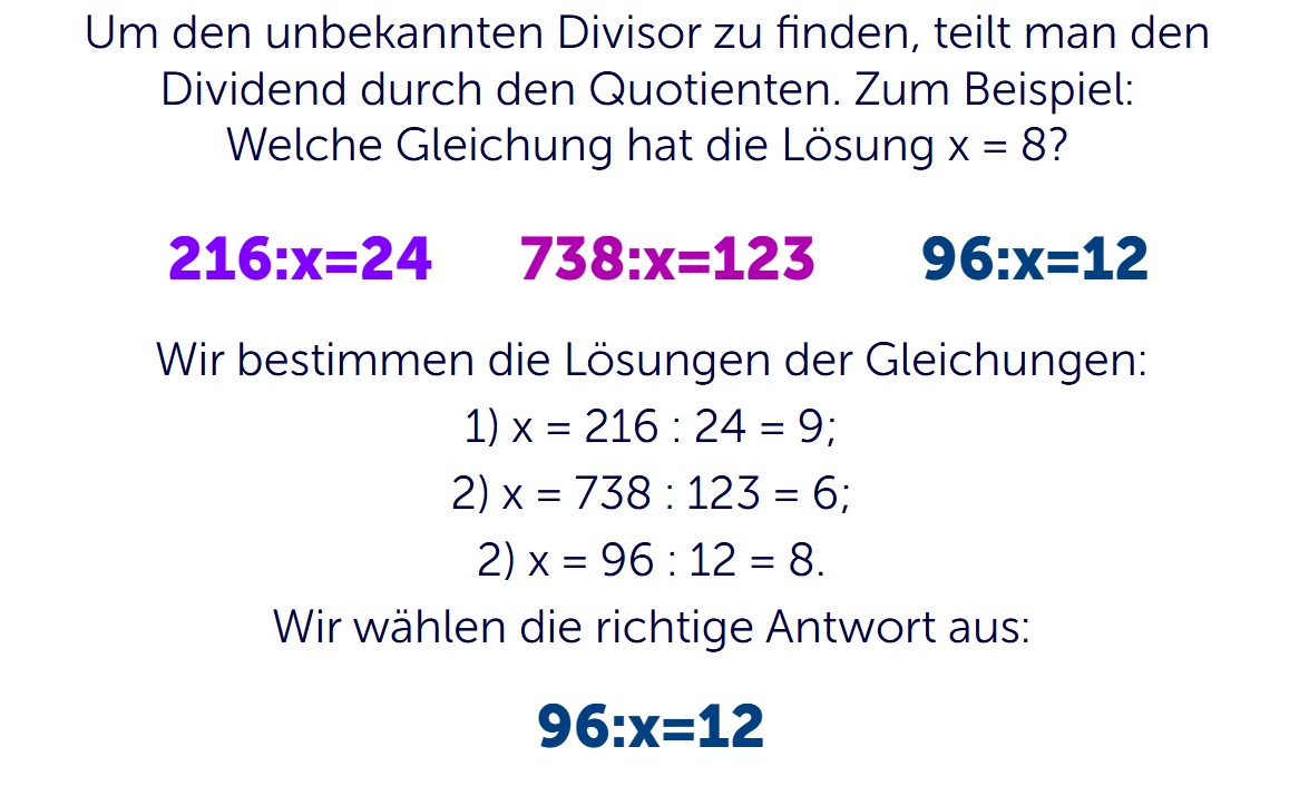 Die Aufgabe ist besonders gut für Kinder der 5. Klasse geeignet. Du trainierst das Rechnen mit Division, das Verstehen von Fachbegriffen und den Umgang mit einer Variablen. Gleichzeitig lernst du, dass die Teile einer Divisionsaufgabe feste Namen haben: Dividend, Divisor und Quotient. Das hilft dir auch später bei schwierigeren Gleichungen.