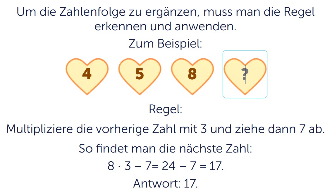 Wenn du Zahlenfolgen regelmäßig übst, wirst du schneller darin, Regeln zu entdecken und richtig umzusetzen. Genau das brauchst du später auch bei schwierigeren Aufgaben. Diese Aufgabe ist deshalb eine gute Vorbereitung für weiteres Lernen in Mathematik: aufmerksam lesen, logisch denken und Schritt für Schritt zur richtigen Lösung kommen.