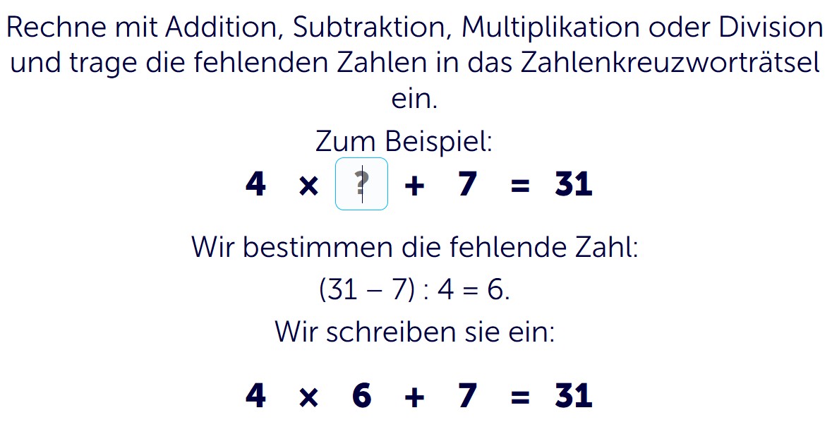In diesem Zahlenkreuzworträtsel trägst du fehlende Zahlen in ein Rechenraster ein. Du rechnest waagerecht und senkrecht und achtest genau auf die Rechenzeichen. So verbindest du mehrere Aufgaben miteinander. Das ist spannend, weil eine gefundene Zahl oft gleich bei der nächsten Rechnung weiterhilft.