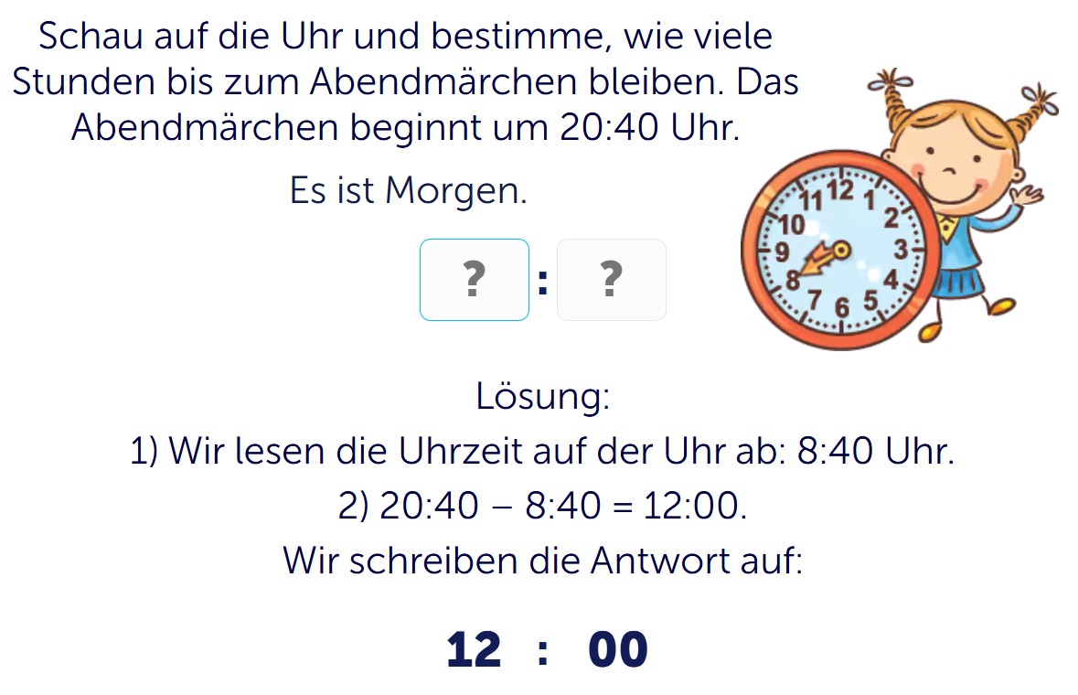 Besonders hilfreich ist, dass die Aufgabe klar aufgebaut ist. Das Kind sieht sofort, worum es geht: Wie viel Zeit bleibt noch bis 15:45 Uhr? Durch die Verbindung aus Bild, Uhr und Antwortkästchen wird das Denken unterstützt. So fällt es leichter, die Lösung selbst zu finden und zu überprüfen.