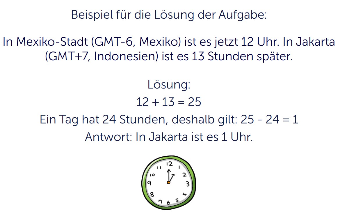 Zeitzonen helfen uns dabei, die Uhrzeit an verschiedenen Orten der Welt zu vergleichen. Da sich die Erde dreht, ist es nicht überall gleichzeitig gleich spät. Deshalb gibt es Länder und Städte mit unterschiedlichen Uhrzeiten. In dieser Übung lernen Kinder, Zeitverschiebungen zu berechnen und die passende Uhrzeit auf einer analogen Uhr zu erkennen. Dafür vergleichen sie die GMT-Angaben zweier Städte und überlegen, ob sie Stunden addieren oder subtrahieren müssen. So trainieren sie nicht nur den Umgang mit Uhrzeiten, sondern auch ihr mathematisches Denken. Die Aufgabe verbindet Sachwissen über die Welt mit wichtigen Grundlagen aus dem Bereich Zeit und Rechnen.
